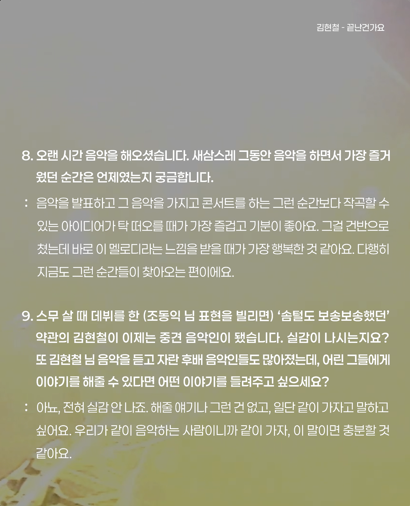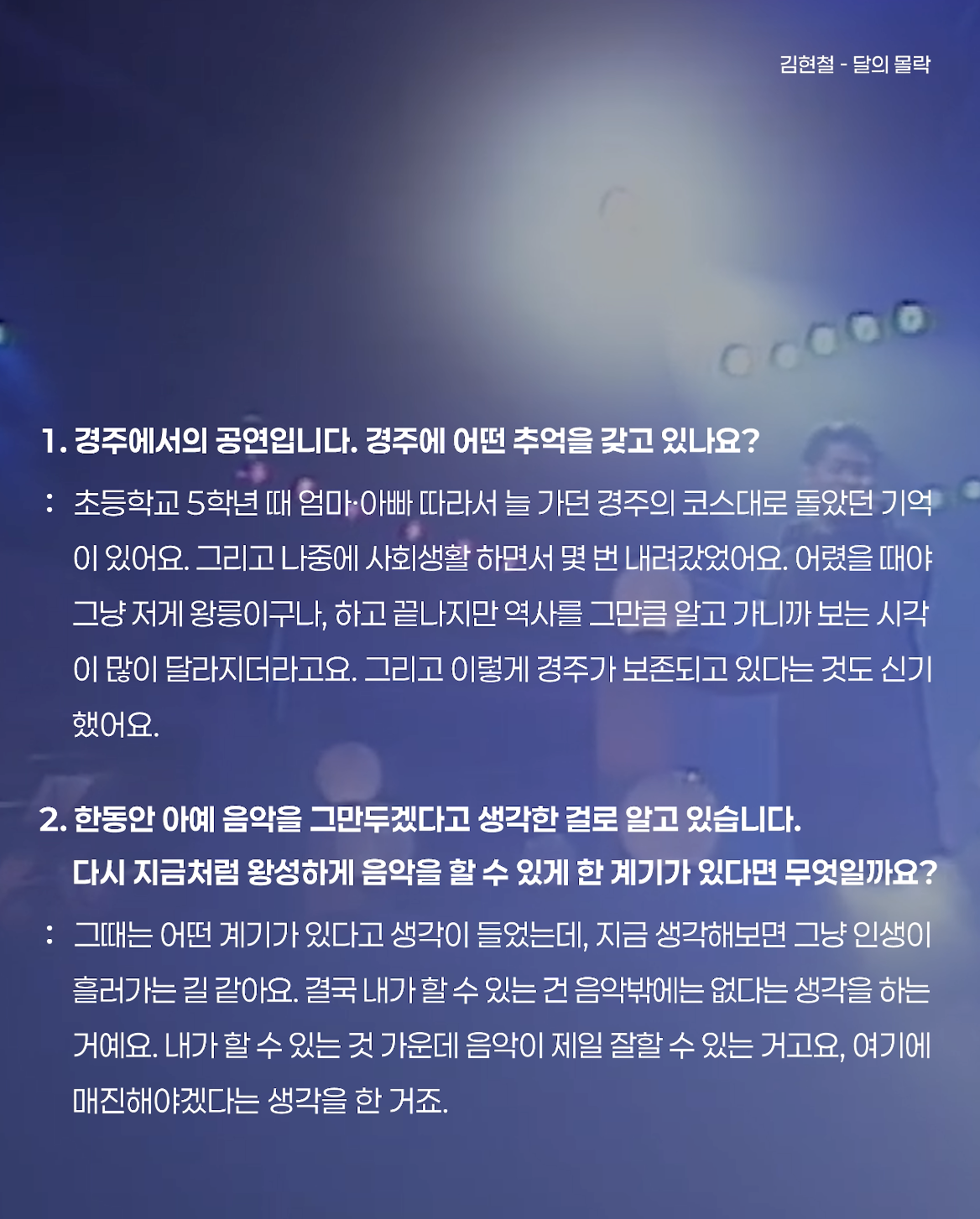 지금 생각해보면 그냥 인생이 흘러가는 길 같아요. 결국 내가 할 수 있는 건 음악밖에는 없다는 생각을 하는 거예요. 내가 할 수 있는 것 가운데 음악이 제일 잘할 수 있는 거고요, 여기에 매진해야겠다는 생각을 한 거죠.