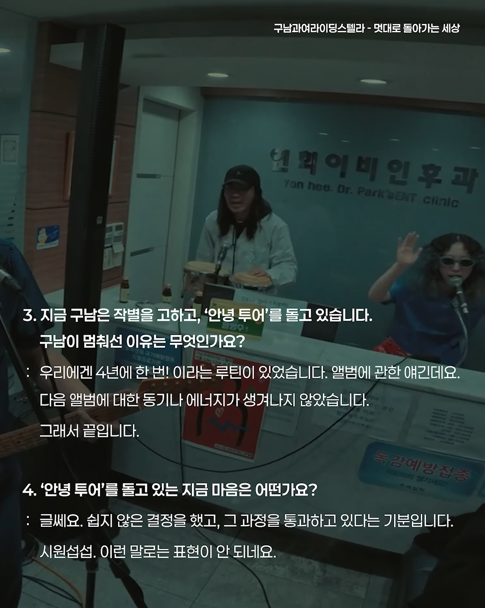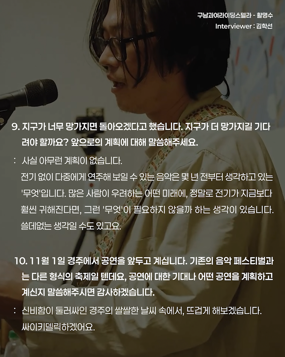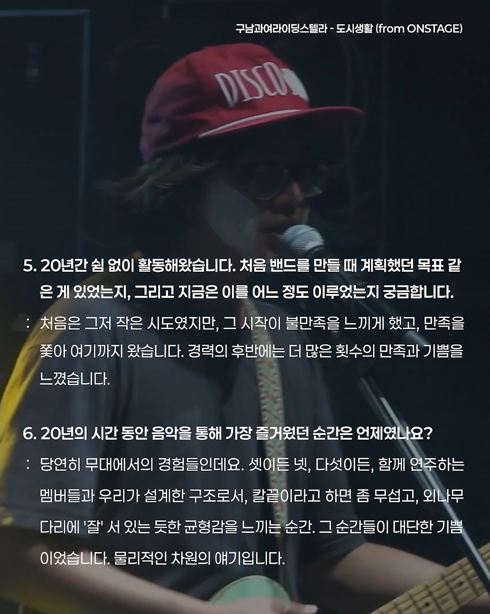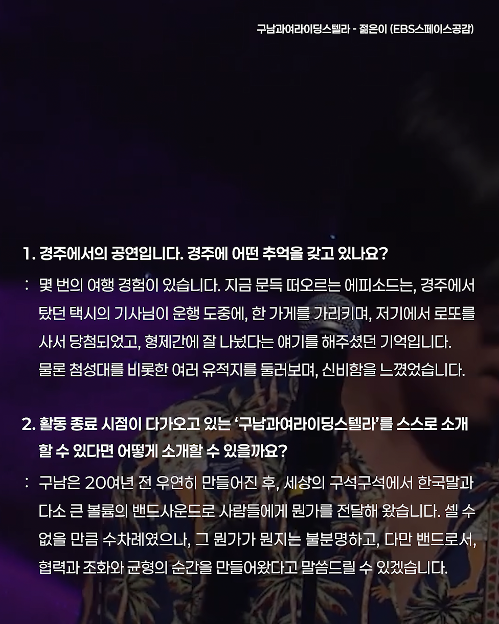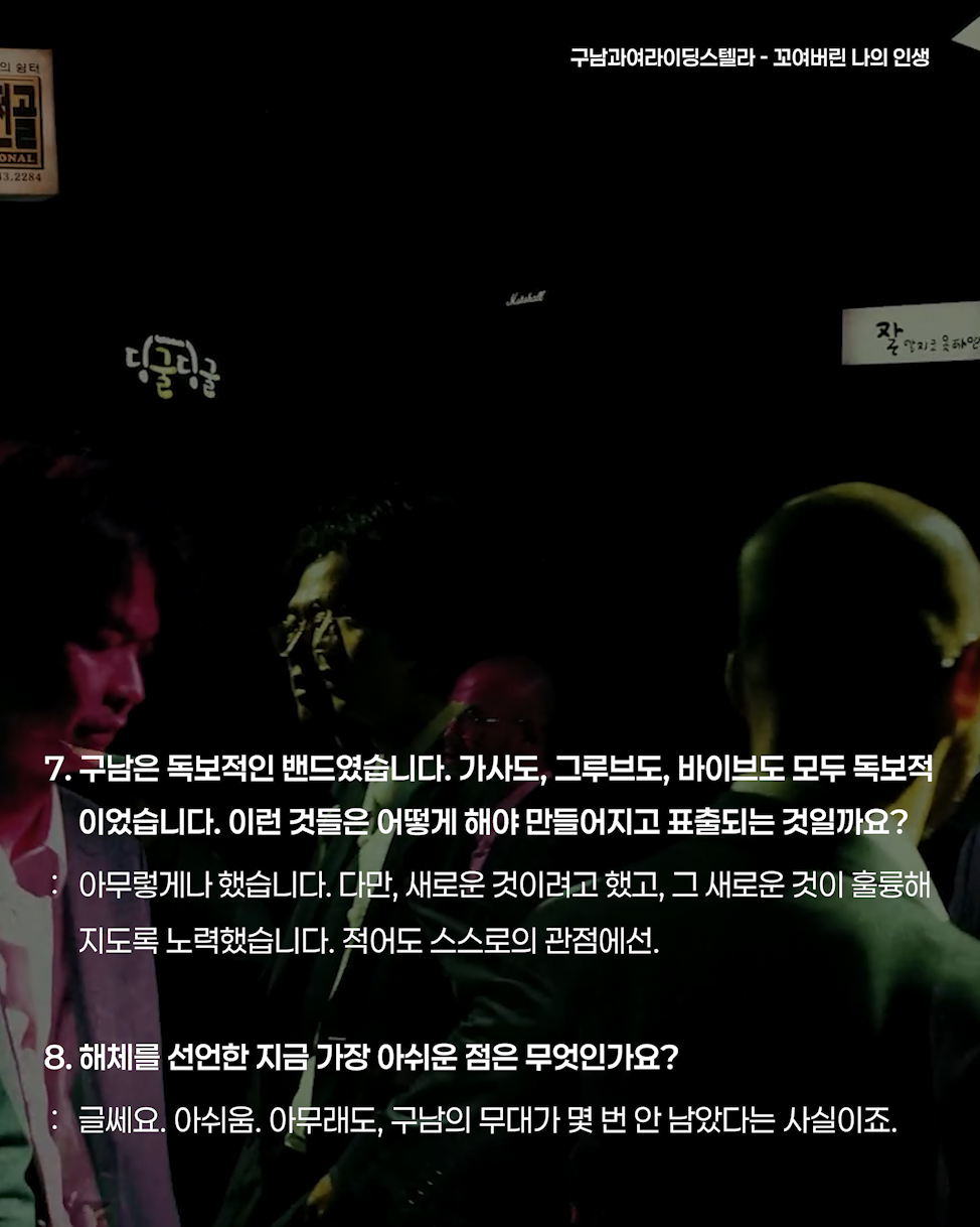 구남은 20여년 전 우연히 만들어진 후, 세상의 구석구석에서 한국말과 다소 큰 볼륨의 밴드사운드로 사람들에게 뭔가를 전달해 왔습니다. 셀 수 없을 만큼 수차례였으나, 그 뭔가가 뭔지는 불분명하고, 다만 밴드로서, 협력과 조화와 균형의 순간을 만들어왔다고 말씀드릴 수 있겠습니다.