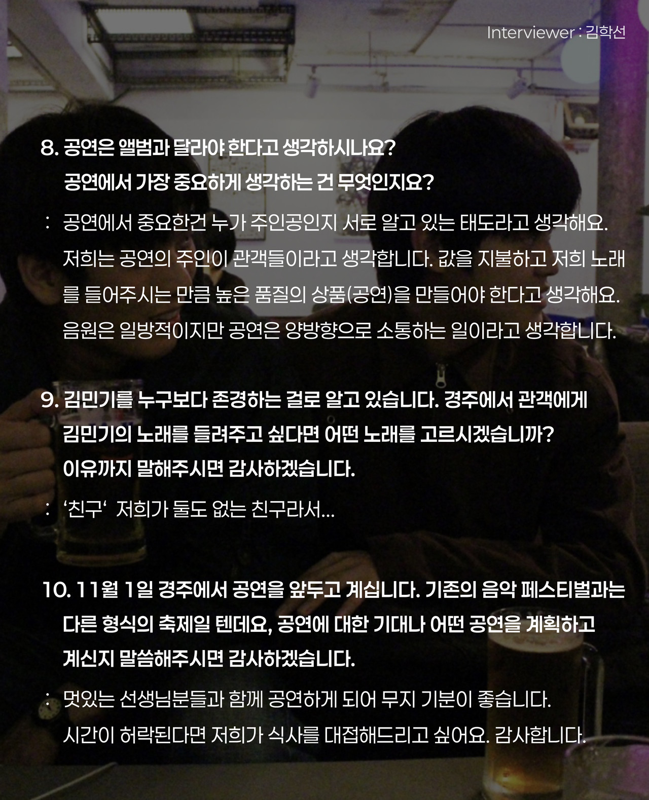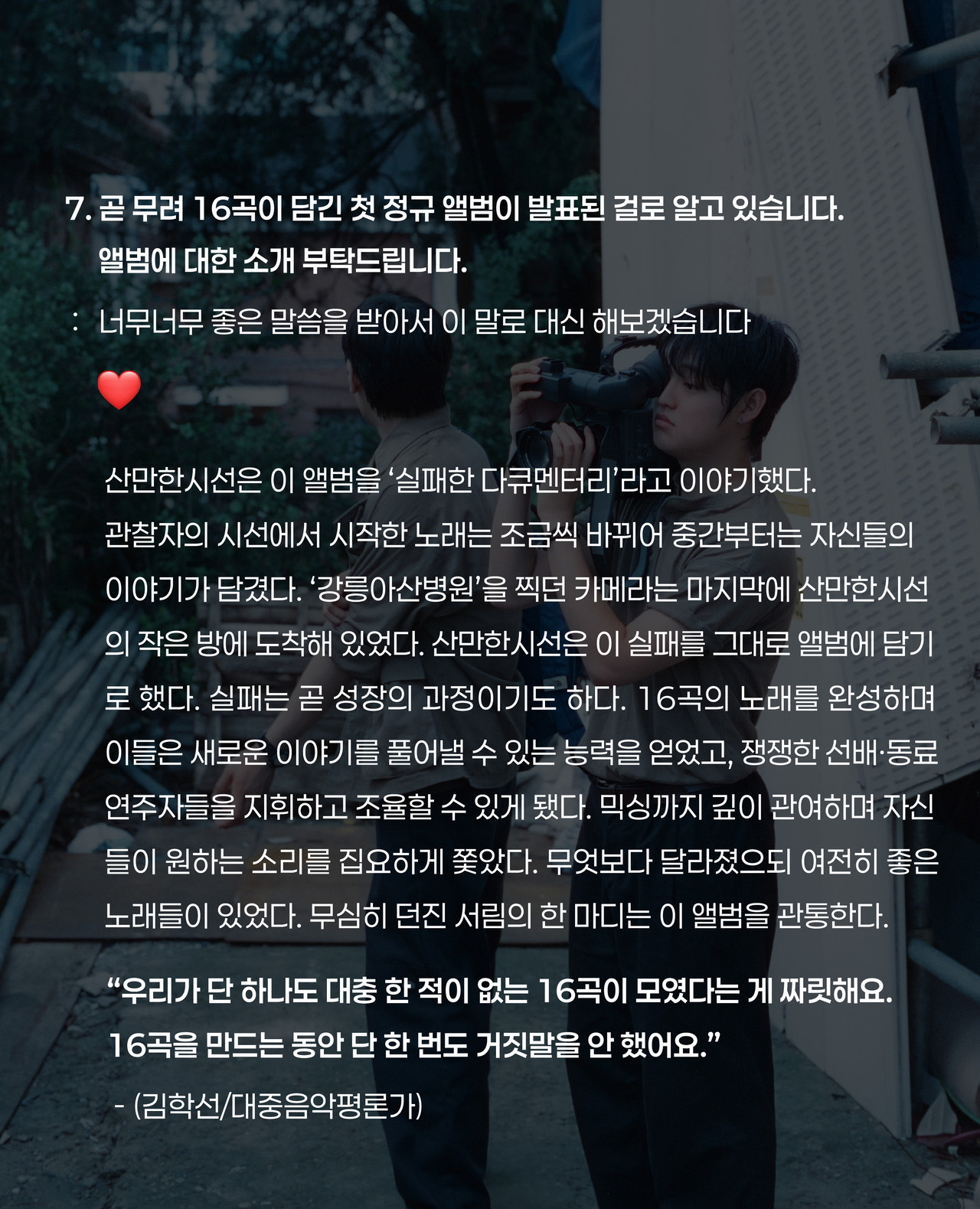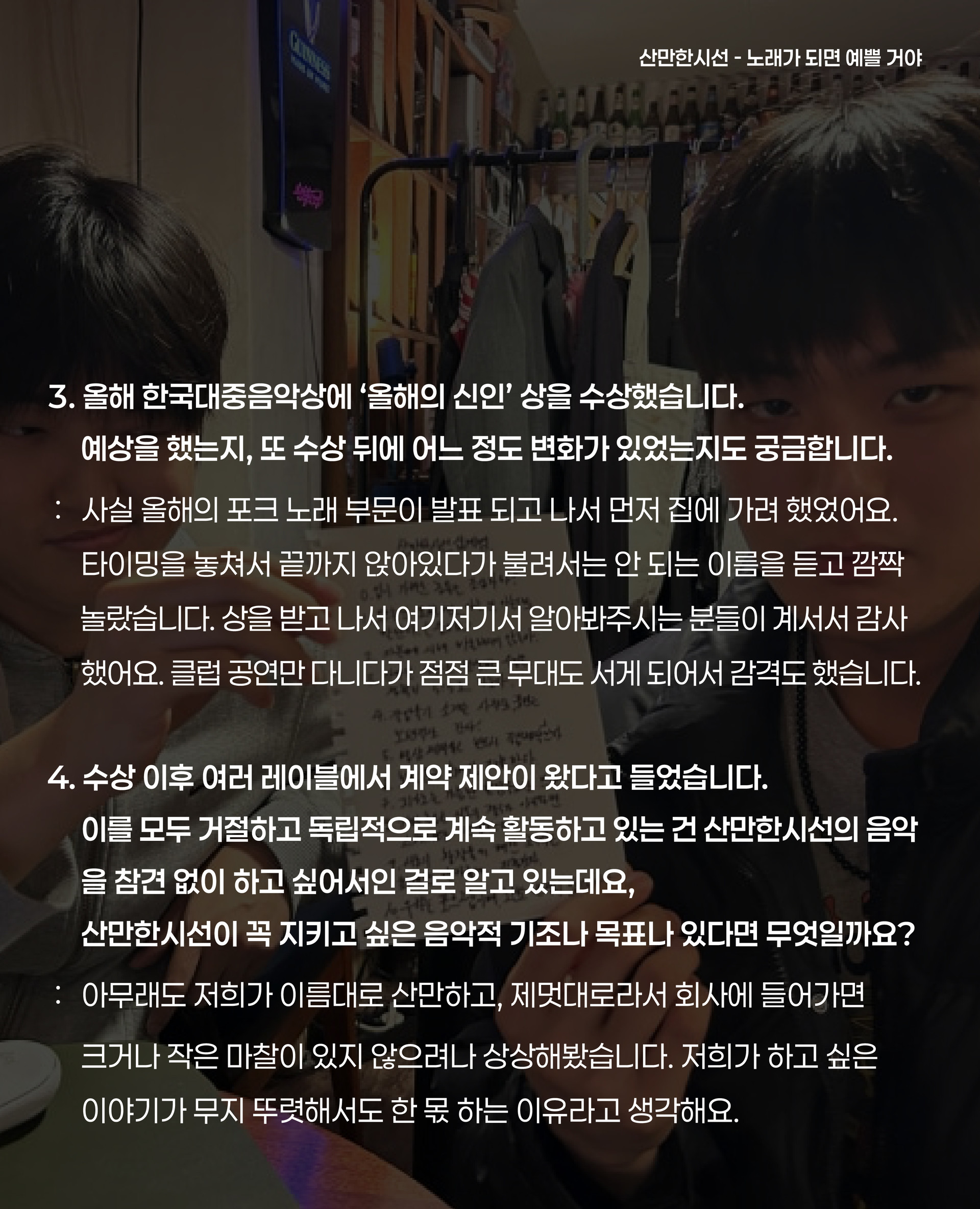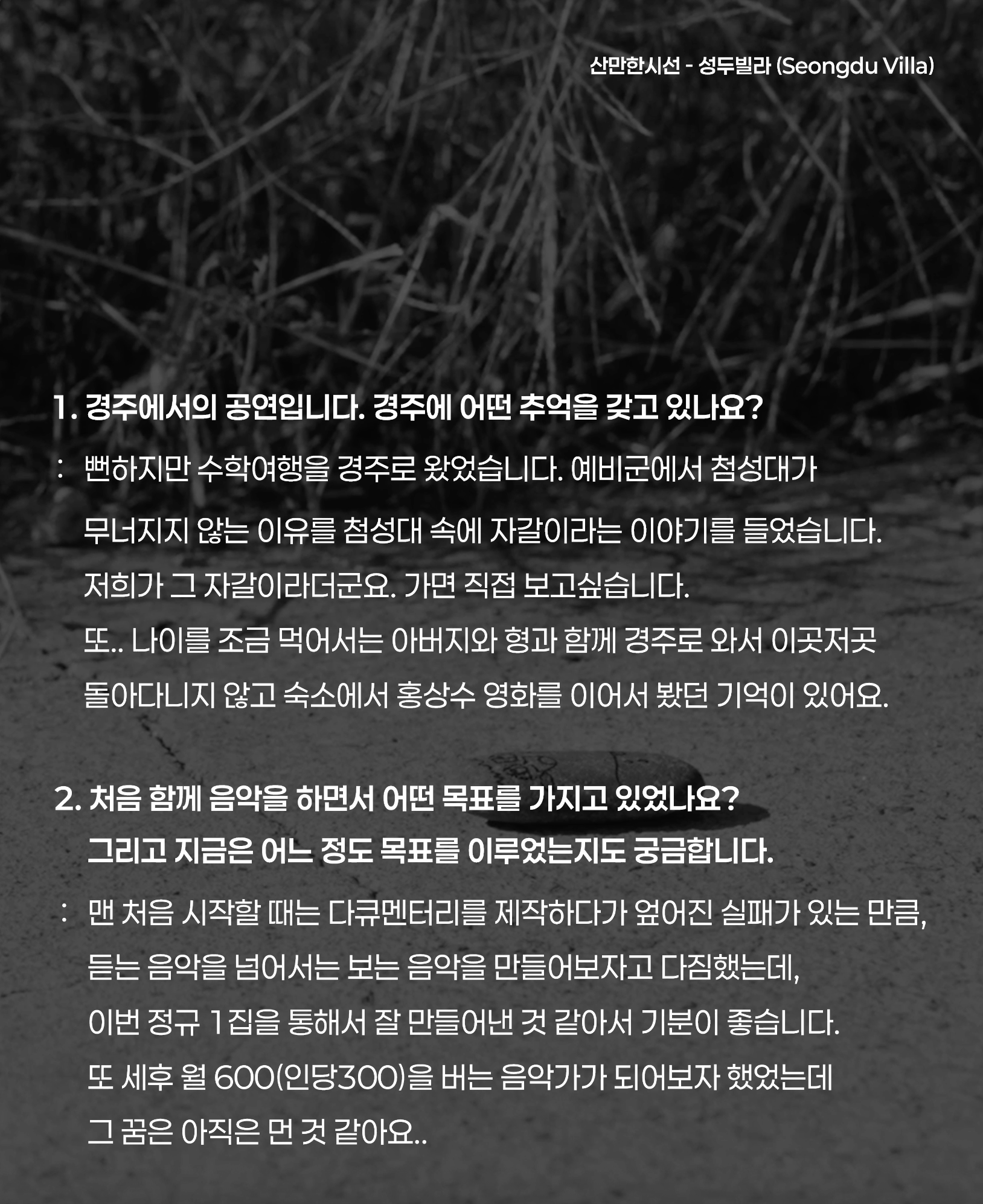 저희 둘이 노래하고자 하는 영역은 늘 생활에 있습니다. 산만하고 가난한 생각들을 가능한 솔직하고 소심하게 만들어내고.
