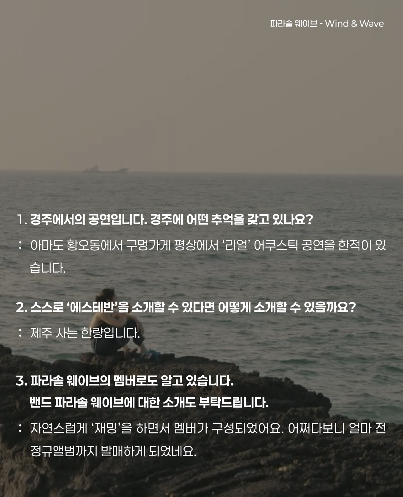 추구하는 바는 크게 다르지 않은데, 함께 하는 이들과 악기에 따라 사운드와 스타일이 달라지는것 같습니다. 밴드 포맷에서는 드라이브가 강하게 걸린 일렉기타를 연주하지만, 같은 곡을 어쿠스틱으로 연주 했을땐 또 달라지니까요. 물론, 솔로가 때로는 밴드 형태가 어울리는 곡은 분명히 있어요. 멤버들의 아이디어가 모여 완성된 곡들도 있거든요. 밴드는 모자란 부분을 채워주지만, 솔로는 투박하게 모자람 그 자체인거죠.