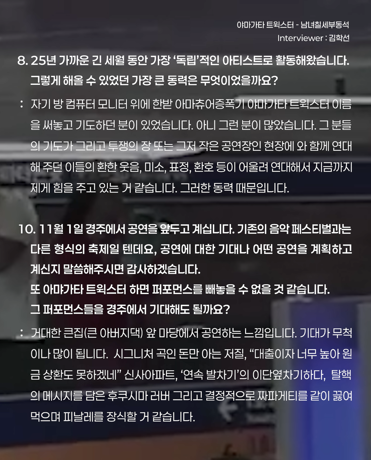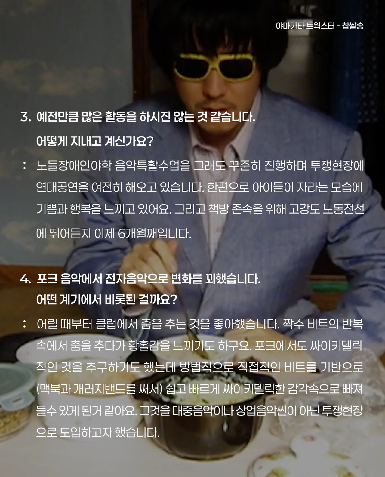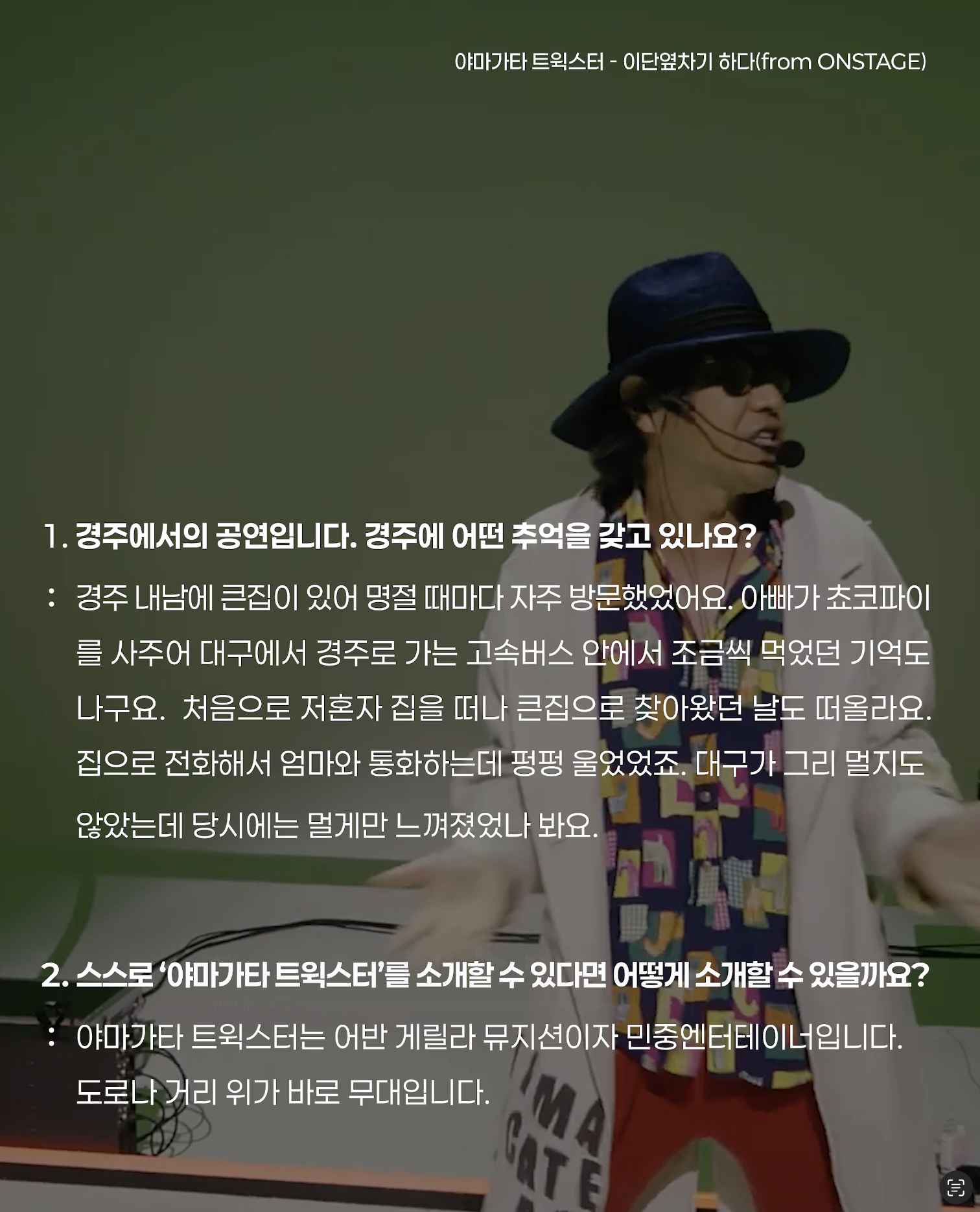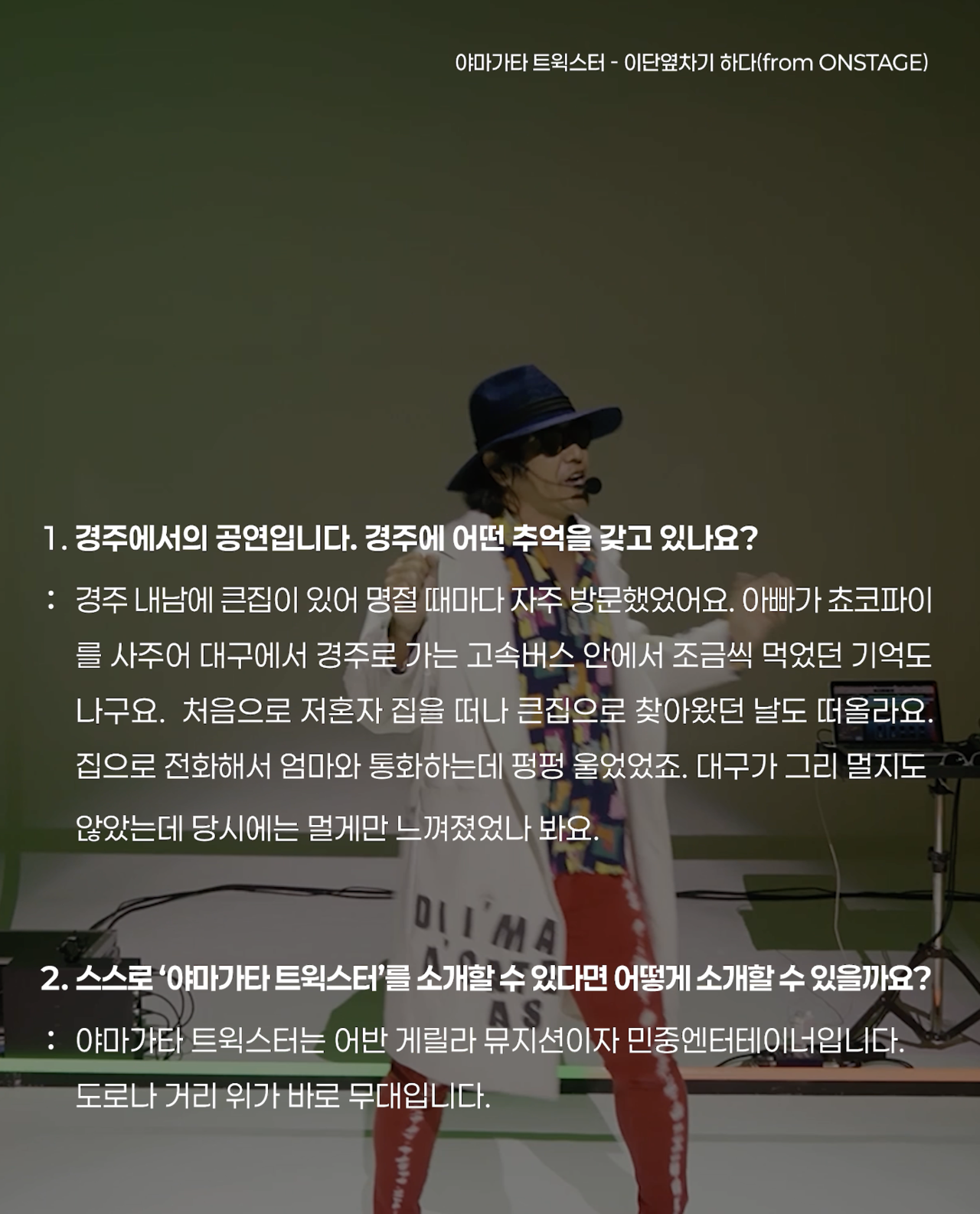 야마가타 트윅스터는 어반 게릴라 뮤지션이자 민중엔터테이너입니다.